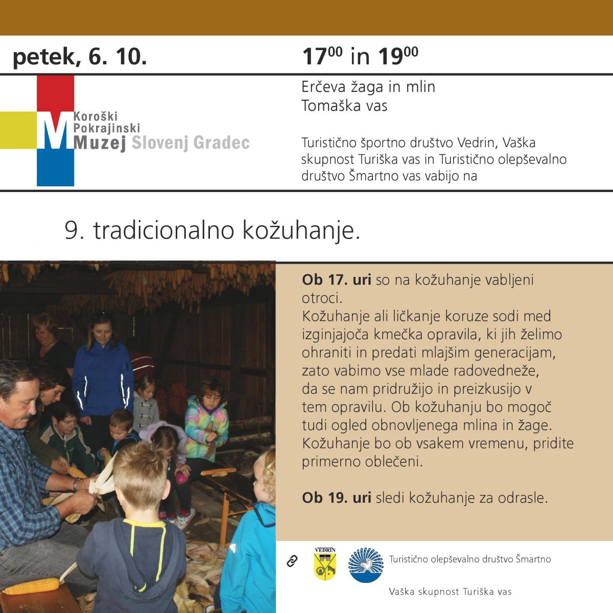 Kožuhanje ali ličkanje koruze sodi med izginjajoča kmečka opravila, ki jih želimo ohraniti in predati mlajšim generacijam, zato vabimo vse mlade radovedneže, da se nam pridružijo in preizkusijo v tem opravilu. Ob kožuhanju bo mogoč tudi ogled obnovljenega mlina in žage. Kožuhanje bo ob vsakem vremenu, pridite primerno oblečeni.