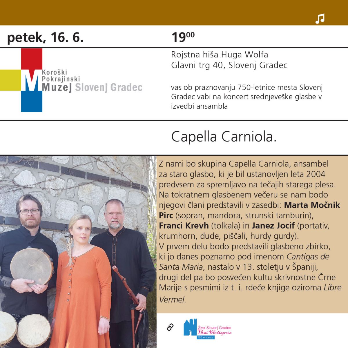 Z nami bo skupina Capella Carniola, ansambel za staro glasbo, ki je bil ustanovljen leta 2004 predvsem za spremljavo na tečajih starega plesa. Na tokratnem glasbenem večeru se nam bodo njegovi člani predstavili v zasedbi: Marta Močnik Pirc (sopran, mandora, strunski tamburin), Franci Krevh (tolkala) in Janez Jocif (portativ, krumhorn, dude, piščali, hurdy gurdy).
