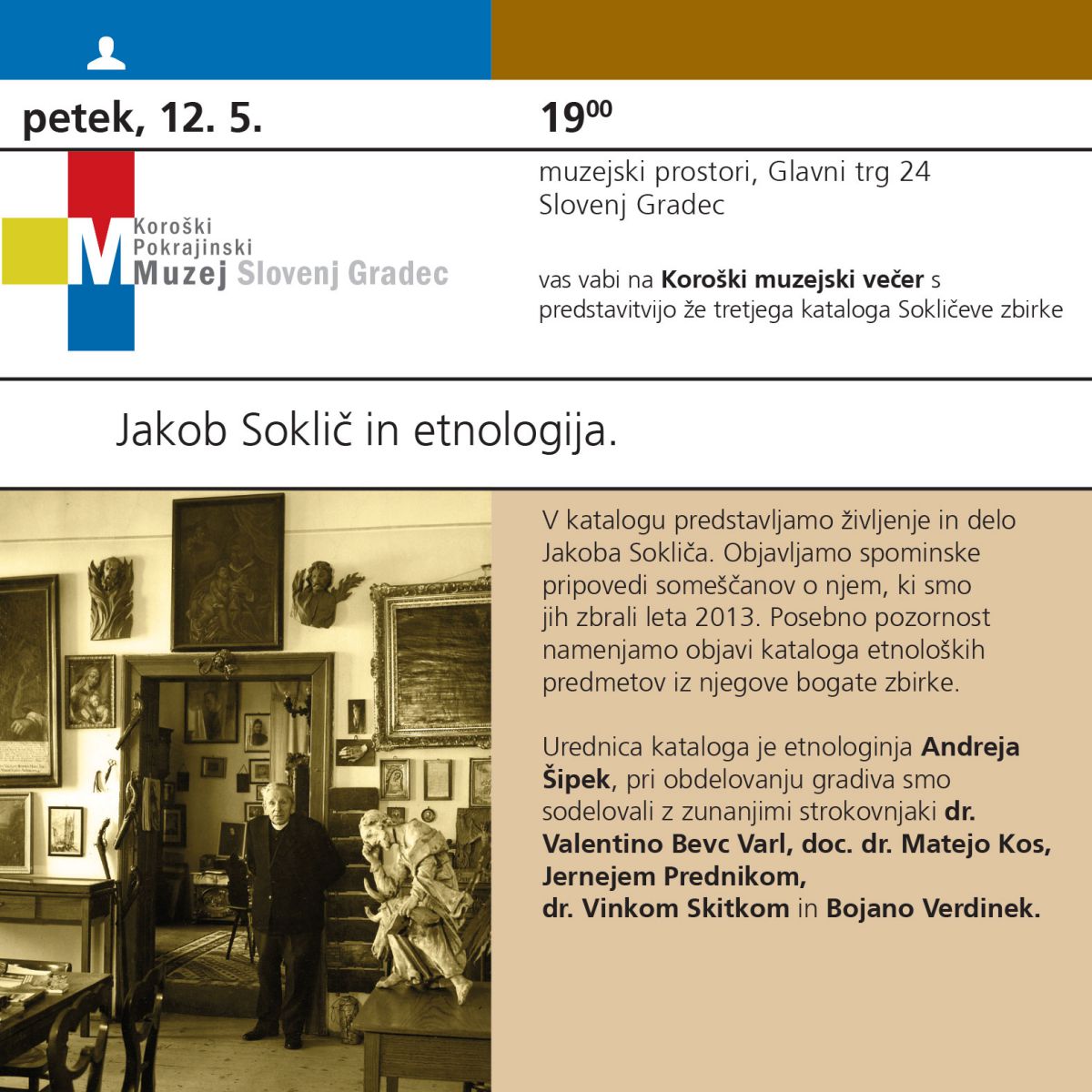 Koroški pokrajinski muzej, Muzej Slovenj Gradec vas v petek, 12. 5. 2017, ob 19.00 vabi v muzejske prostore, Glavni trg 24, Slovenj Gradec na Koroški muzejski večer s predstavitvijo že tretjega kataloga Sokličeve zbirke