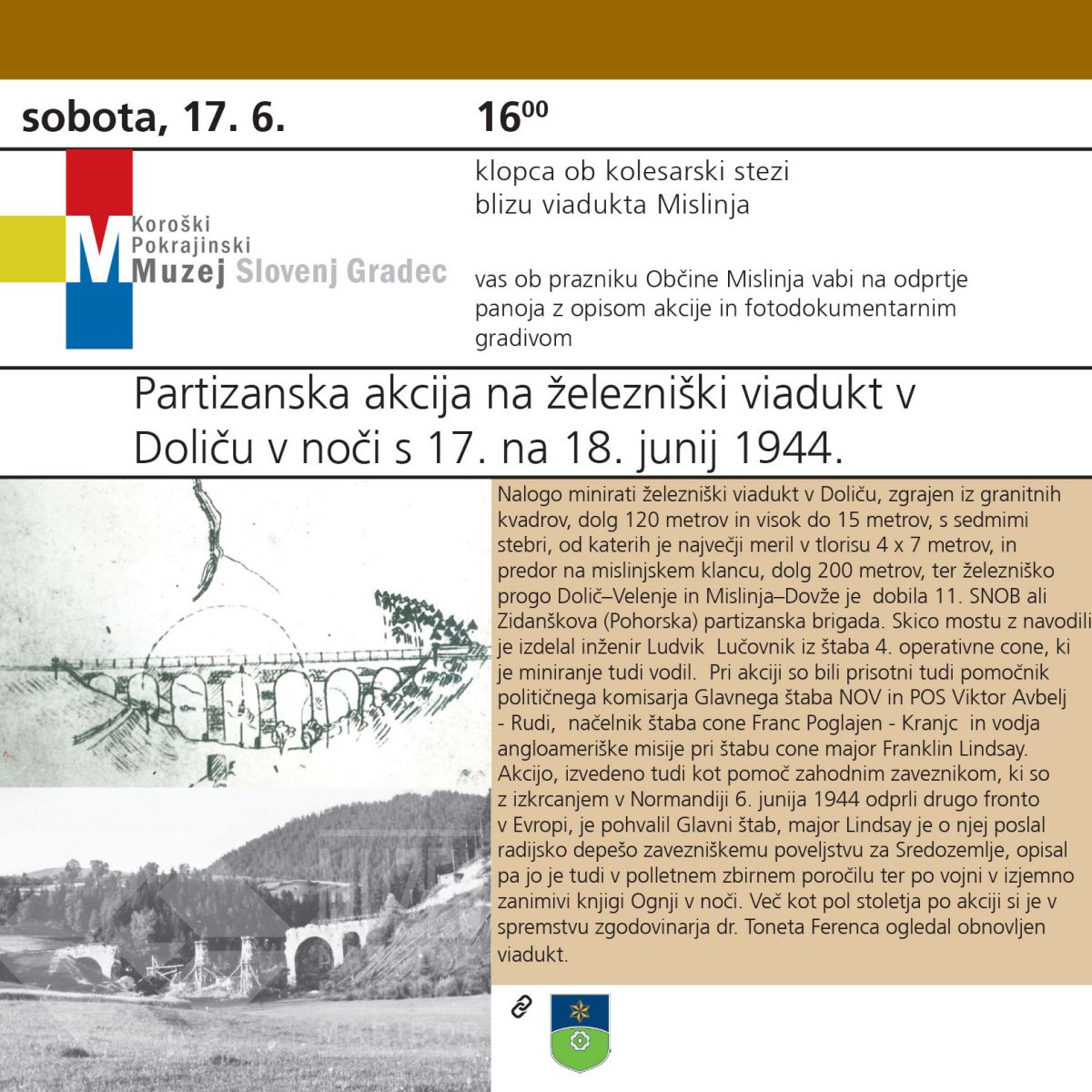 Koroški pokrajinski muzej, Muzej Slovenj Gradec vas ob prazniku Občine Mislinja vabi v soboto, 17. junija 2017, ob 16. 00 h klopci ob kolesarski stezi blizu viadukta Mislinja na odprtje panoja z opisom