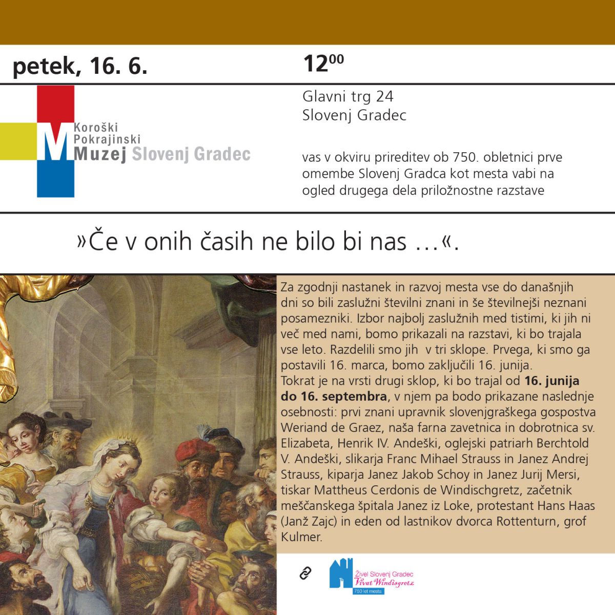 Koroški pokrajinski muzej, Muzej Slovenj Gradec vas v okviru prireditev ob 750. obletnici prve omembe Slovenj Gradca kot mesta vabi v petek, 16. 6. 2017, ob 12.00 na Glavni trg 24, Slovenj Gradec na ogled drugega dela priložnostne razstave