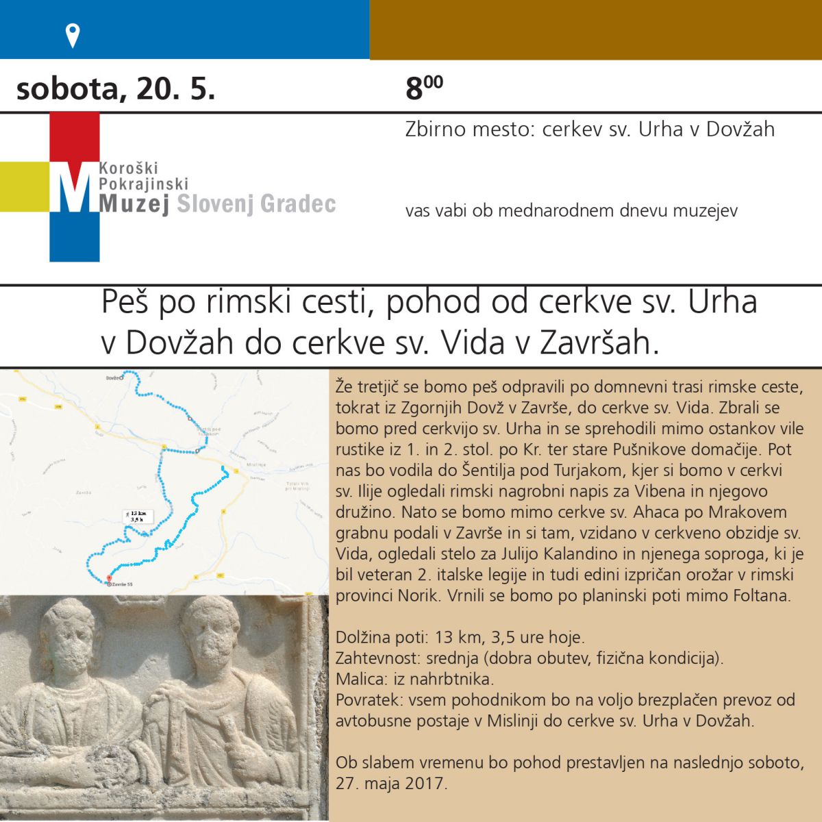 Že tretjič se bomo peš odpravili po domnevni trasi rimski cesti, tokrat iz Zgornjih Dovž v Završe, do cerkve sv. Vida. Zbrali se bomo pred cerkvijo sv. Urha in se sprehodili mimo ostankov vile rustike iz 1. in 2. stol. po Kr. ter stare Pušnikove domačije. Pot nas bo vodila do šentilja pod Turjakom, kjer si bomo v cerkvi sv. Ilije ogledali rimski nagrobni napis za Vibena in njegovo družino. Nato se bomo mimo cerkve sv. Ahaca po Mrakovem grabnu podali v Završe in si tam, vzidano v cerkveno obzidje sv. Vida, ogledali stelo za Julijo Kalandino in njenega soproga, ki je bil veteran 2. italske legije in tudi edini izpričan orožar v rimski provinci Norik. Vrnili se bomo po planinski poti mimo Foltana.