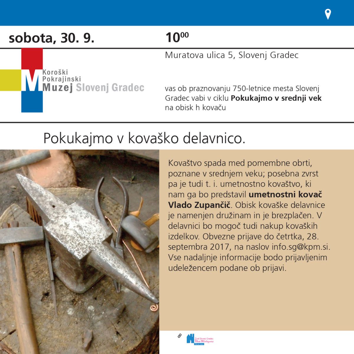 Kovaštvo spada med pomembne obrti, poznane v srednjem veku; posebna zvrst pa je tudi t. i. umetnostno kovaštvo, ki nam ga bo predstavil umetnostni kovač Vlado Zupančič. Obisk kovaške delavnice je namenjen družinam in je brezplačen. V delavnici bo mogoč tudi nakup kovaških izdelkov. Obvezne prijave do četrtka, 28. septembra 2017, na naslov info.sg@kpm.si. Vse nadaljnje informacije bodo prijavljenim udeležencem podane ob prijavi.