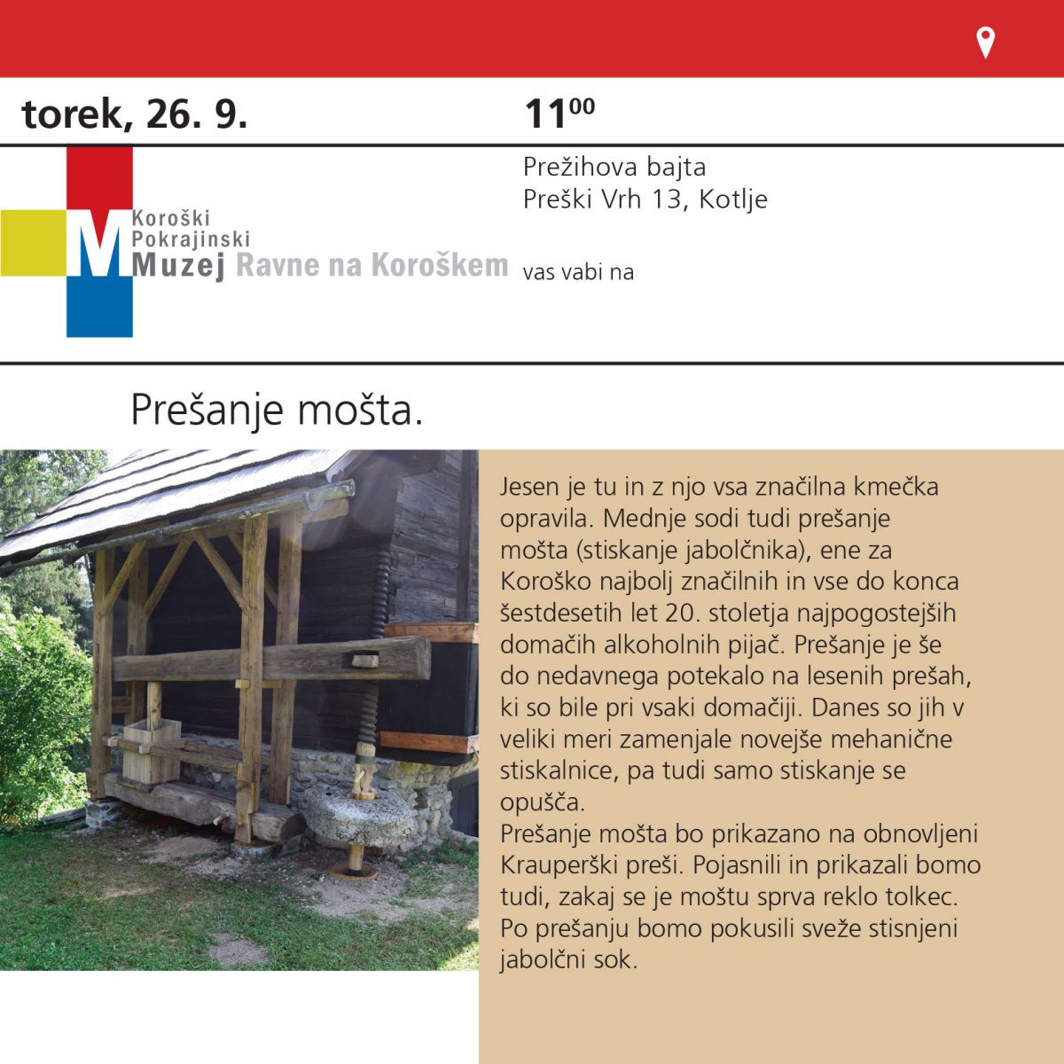 Jesen je tu in z njo vsa značilna kmečka opravila za domačije. Mednje sodi tudi prešanje mošta (stiskanje jabolčnika), ene za Koroško najbolj značilnih in vse do konca šestdesetih let 20. stoletja najpogostejših domačih alkoholnih pijač. Prešanje je še do nedavnega potekalo na lesenih prešah, ki so bile pri vsaki domačiji. Danes so jih v veliki meri zamenjale novejše mehanične stiskalnice, pa tudi samo stiskanje se opušča.