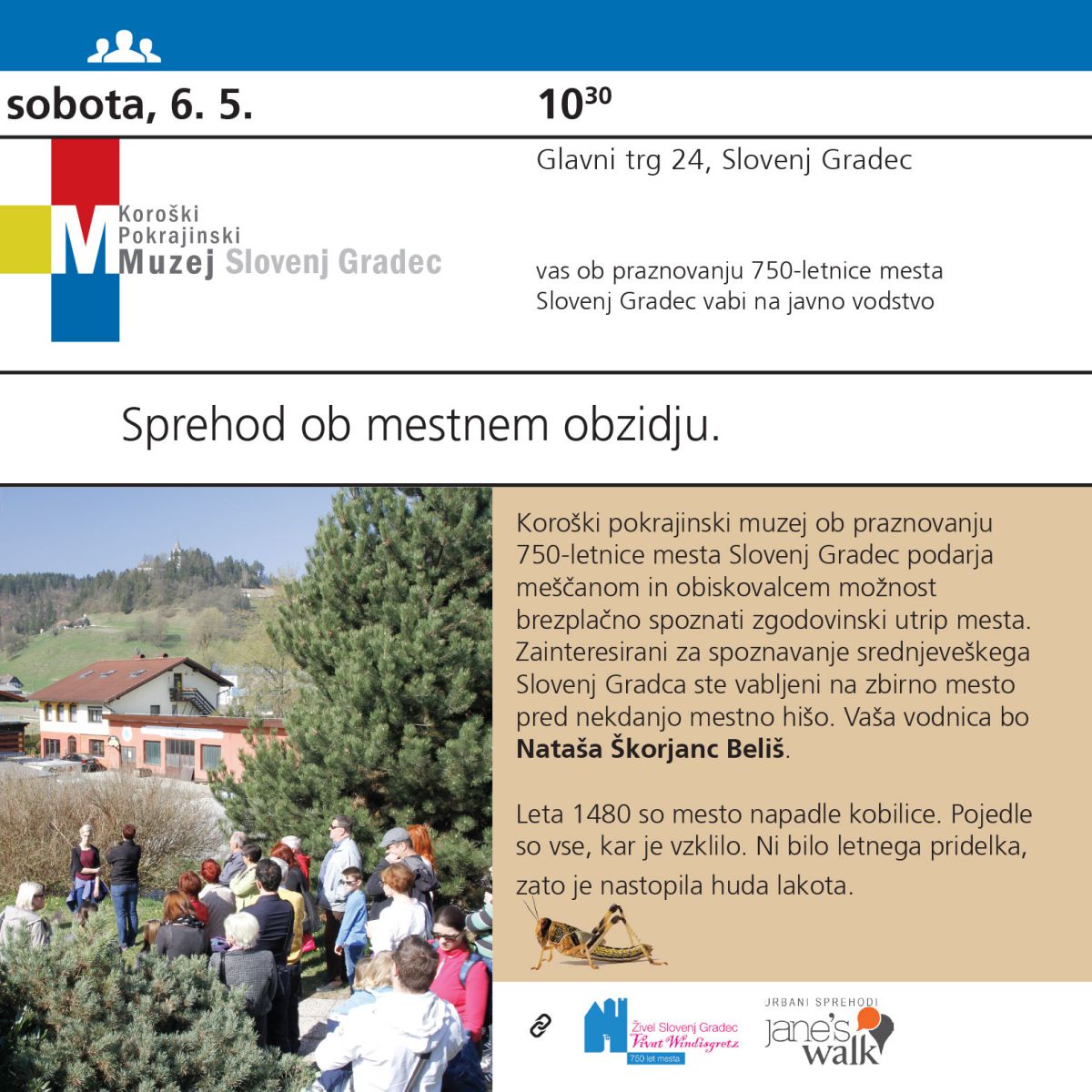 Koroški pokrajinski muzej ob praznovanju 750-letnice mesta Slovenj Gradec podarja meščanom in obiskovalcem možnost brezplačno spoznati zgodovinski utrip mesta. Zainteresirani za spoznavanje srednjeveškega Slovenj Gradca ste vabljeni na zbirno mesto pred nekdanjo mestno hišo. Vaša vodnica bo Nataša škorjanc Beliš.